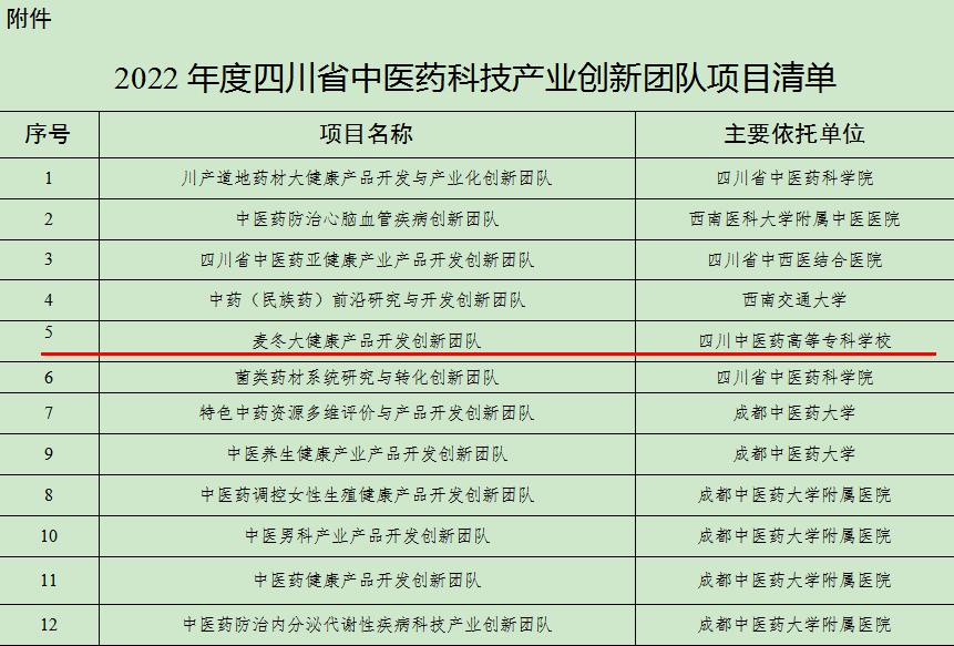 近日,四川省中医药管理局公布2022年度四川省中医药科技产业创新团队入选团队名单。由北京大学屠鹏飞教授作为团队负责人,我司作为联合申报单位的“麦冬大健康产品开发创新团队”成功入选四川省中医药科技产业创新团队(共12个团队入选),同时也是绵阳市成功入选的唯一团队! “麦冬大健康产品开发创新团队”是以川麦冬主产地绵阳属地大学“四川中医药高等专科学校”为依托,强强联合我国知名高等学府“北京大学”以及专业从事麦冬产业化的“四川德培源中药科技开发有限公司”共同组建。团队根据麦冬滋阴润肺、化痰止咳、清心除烦的传统功效,以及麦冬及其须根具有的止咳化痰、预防肺纤维化、降血糖、抗氧化、延缓衰老、增加免疫力、抗肿瘤等方面的药理作用(现代医药学已证明),深度挖掘麦冬及其须根的保健、治疗功能及其物质基础,并阐明其作用机制;同时,利用多年积累的研究成果,进行成果开发转化,取得6个以上食品、保健品批文或备案,并实现工业化和批量产品上市,为将麦冬打造成为500亿产值的中药材大品种奠定基础。 在健康中国战略与新冠肺炎疫情的大背景下,“麦冬大健康产品开发创新团队”将积极工作,深入研究,通过不断的创新与探索,把团队打造成一支包括麦冬优质药材生产、药用和保健功能深度挖掘、药品和健康产品开发、全产业链质量控制的全球领先的麦冬产业创新团队,在麦冬及麦冬须根的研究上引领全国学术发展方向,同时长期服务于麦冬产业发展,为全国麦冬产业的可持续、高质量发展提供强大的科技支撑。